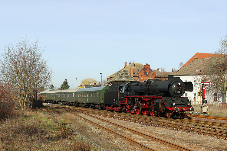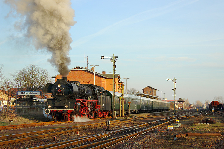 So wie früher der P 6454 fährt die 03 mit dem Zug aus Gleis 1 in Richtung Oebisfelde aus.