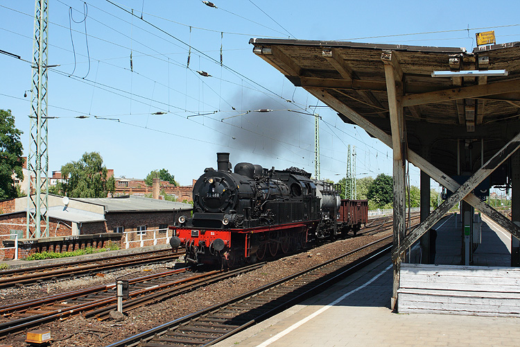 Ich staunte nicht schlecht, als am 06.06.2013 bei einer Fototour in Magdeburg eine preußische T 18 auftauchte. 78 468 weilte an jenem Tag mit dem "Zug der Erinnerung", der an die Deportation der Juden in Deutschland mit der Reichsbahn erinnert, im Magdeburger Hauptbahnhof. Zwischendurch fuhr sie samt ihrer mitgebrachten Kohle- und Wasservorräte zum Restaurieren zur Hafenbahn, bei der Rückfahrt zum Hbf gelang dann im Bahnhof Neustadt dieses Bild.