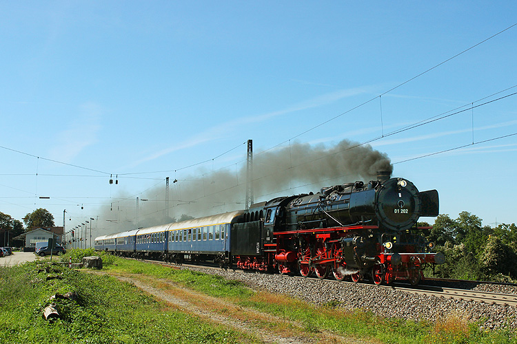 Bei meinem ersten Besuch der Rheintalbahn war dieser Zug die größte Überraschung - 01 202 mit einem Sonderzug von Basel nach Stuttgart - Heitersheim, 13.09.2019. |