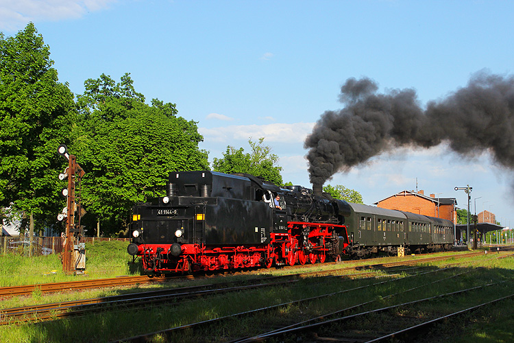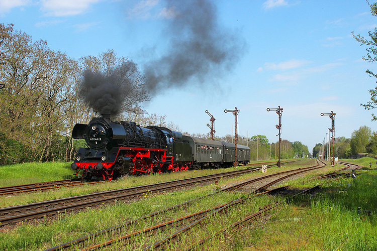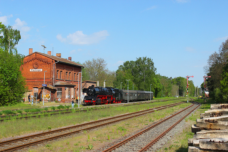 Am Wochenende 13./14.05.2023 fuhr 41 1144 anläßlich des Bahnhofsfest in Oebisfelde jeweils drei Zugpaare nach Haldensleben und zurück. Hier fährt der erste Zug des Tages in Flechtingen ein, 13.05.2023. |