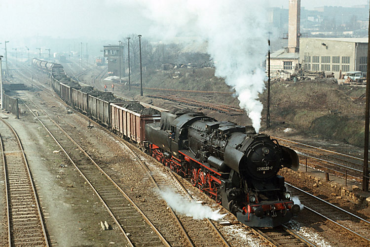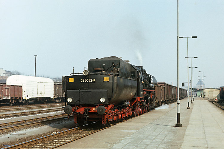 Kurz vor meiner Heimfahrt kam noch 52 8022 mit dem nun leeren Erzpendel aus Helbra zurück den sie wieder nach Niederröblingen brachte, 27.03.1982. |