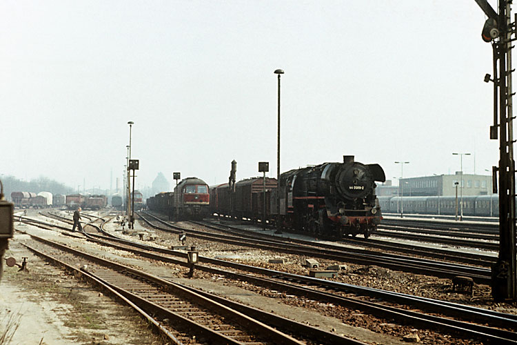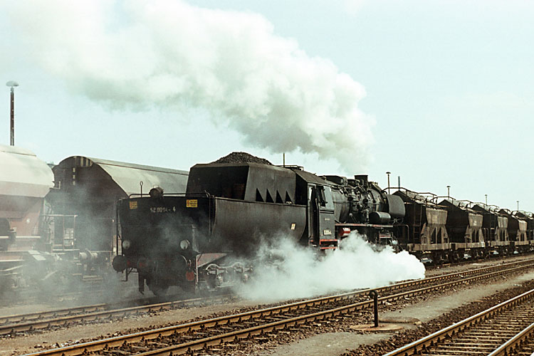 Nun sah es auf den Gütergleisen aus wie in alten Zeiten, denn auch 44 0093 war aus dem Bw zurück und hatte sich als Vorspann vor eine 131 mit Güterzug nach Nordhausen gesetzt. Rechts im Bild noch die zwei Brandenburger 52 8181 + 52 8018, die auf der Heimfahrt aus dem Ausbesserungswerk Meiningen waren und als Schubloks an einen Güterzug nach Güsten gingen. |