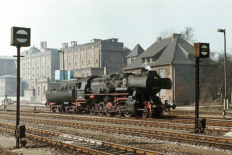 Bei meiner Spontantour am 27.03.1982 bekam ich zunächst die neue Dampflok-Baureihe des Bw Sangerhausen vor die Linse - 52 8022 verläßt mit dem Erzpendel Niederröblingen - Helbra den Bahnhof Sangerhausen in Richtung Blankenheimer Steilrampe. Solche schweren Züge bergwärts ohne Schiebelok, das war auf Dauer der Tod der 52er. So endete diese Lok nur ein Jahr später unter dem Schneidbrenner. |
