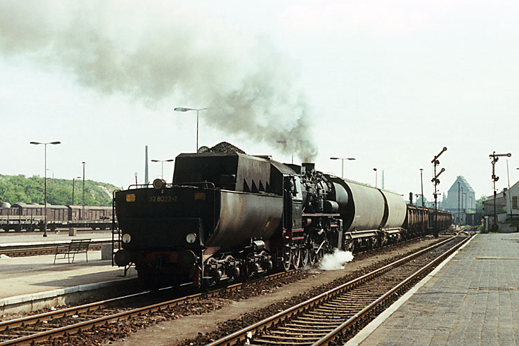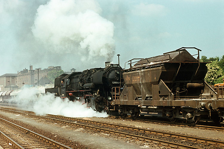 Die zweite Tour nach Sangerhausen machte ich am 30.05.1982. Für den Sommerfahrplan hatte man die Umläufe der 52 umgestellt, nun wurden die Loks vor allem im Schiebedienst auf der Blankenheimer Steilrampe verwendet. 52 8022 schob kurz nach meiner Ankunft in Sangerhausen diesen Gipszug nach. |