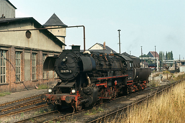 Auch die kalt abgestellte Heizlok des Bw Nordhausen 52 8179 konnte ich an jenem Tag noch aufnehmen. Ihr hatte man die letzte Kuppelachse ausgebaut, um den Aschkasten besser reinigen zu können. Ein halbes Jahr später wurde der Planeinsatz der 52er hier beendet, ich konnte mich vorher zu keiner Tour zu ihnen mehr aufraffen. Damit wäre das Thema "Dampf restliche DDR" abgehandelt. |