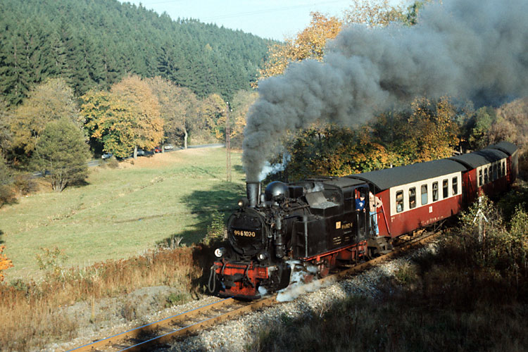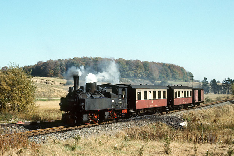 Mit der Rückleistung nach Gernrode, dem P 14466, hat 99 6001 Hasselfelde verlassen, 15.10.1989. |