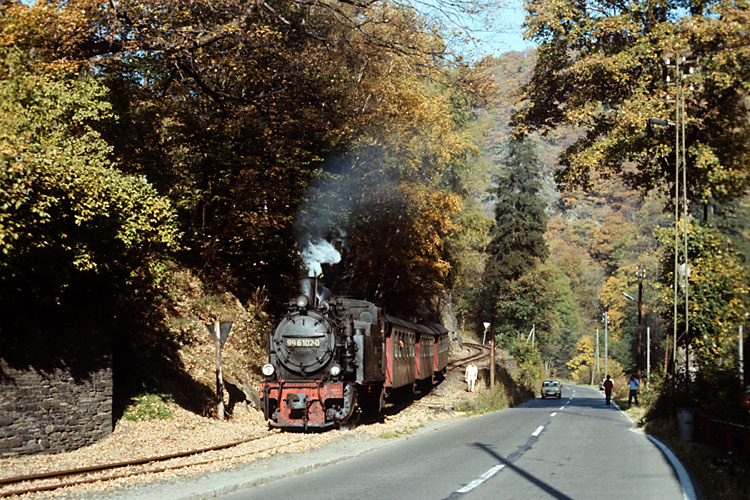 Den Nachmittagszug P 14465 nach Hasselfelde hatte an jenem Tag wieder einmal 99 6102 am Haken, die eigentlich nur selten im Personenzugdienst eingesetzt wurde. Ihr Zug bestand bereits aus modernisierten Wagen, die nun auch im Selketal zum Einsatz kamen, soeben hat er den Bahnhof Mägdesprung in Richtung Alexisbad verlassen. |