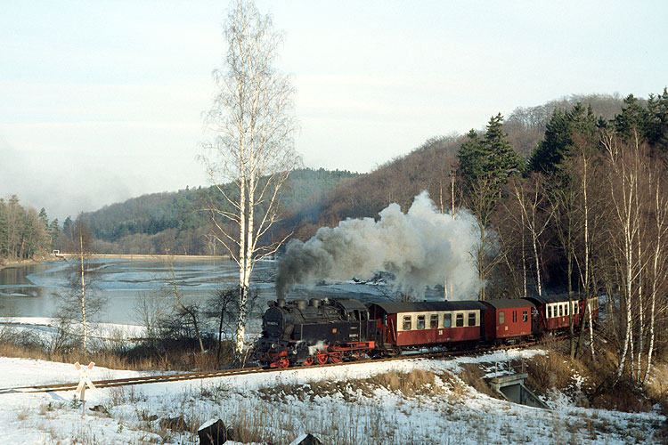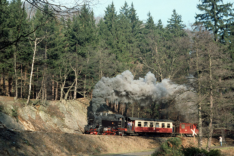 Im schneearmen Winter 1990 war ich wieder einmal an der Selketalbahn unterwegs. Ungeachtet der großen politischen Veränderungen lief der Betrieb wie gehabt weiter. 99 6001 war wieder einmal mit dem P 14465 von Gernrode nach Hasselfelde unterwegs, hier die Ausfahrt Sternhaus-Haferfeld, 17.02.1990. |