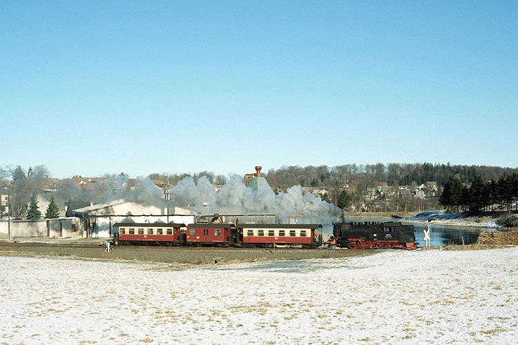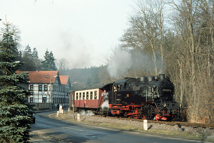 Wenig später rollt 99 6001 mit dem P 14465 nach Alexisbad herein, 17.02.1990. |