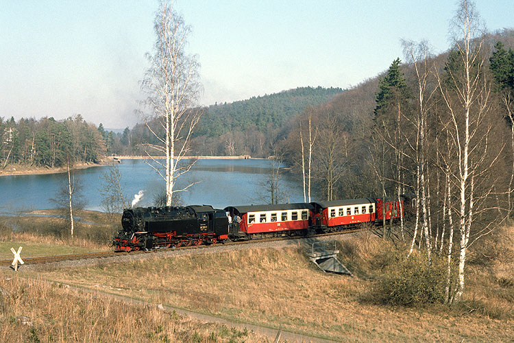 Die Neubaulokomotiven der Bauart 99.23-24 hatten inzwischen seit Jahren die Vorherrschaft auf der Selketalbahn übernommen, nur 99 6001 war von den kleineren Loks 1990 noch hier im Einsatz. Am 17.03.1990 kam der P 14465 bei Günthersberge jedenfalls mit der "großen" 99 7238 angefahren. |