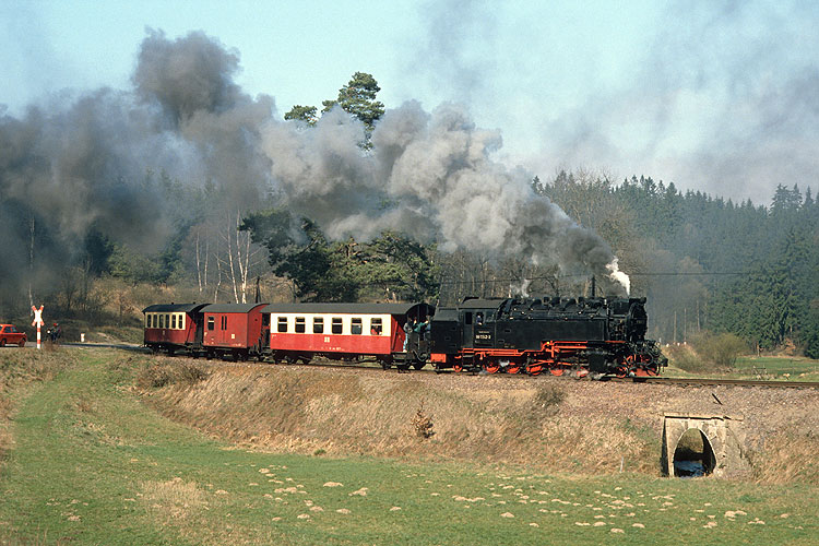 99 7237 rollt bei Mägdesprung mit dem P 14465 in Richtung Alexisbad, 31.03.1990. |