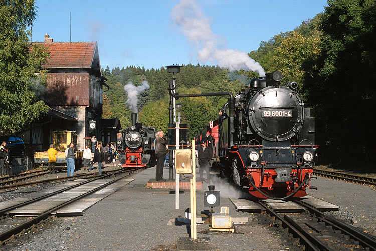 Am 04.10.2003 war ich nach langen Jahren mal wieder im Selketal nach dem Rechten schauen und hatte das Glück, 99 6001 und 99 5906 im Einsatz zu erleben, wie in alten Zeiten! Der Wasserkran wurde inzwischen an den Bahnsteig versetzt, ansonsten hat sich im Bahnhof Alexisbad bis heute nicht viel verändert. So kann man hier noch immer echte Schmalspurbahn-Romantik erleben, besuchen Sie doch einmal diese tolle Strecke, es lohnt sich! Auf den nächsten Seiten geht es nun mit der Harzquerbahn weiter. |