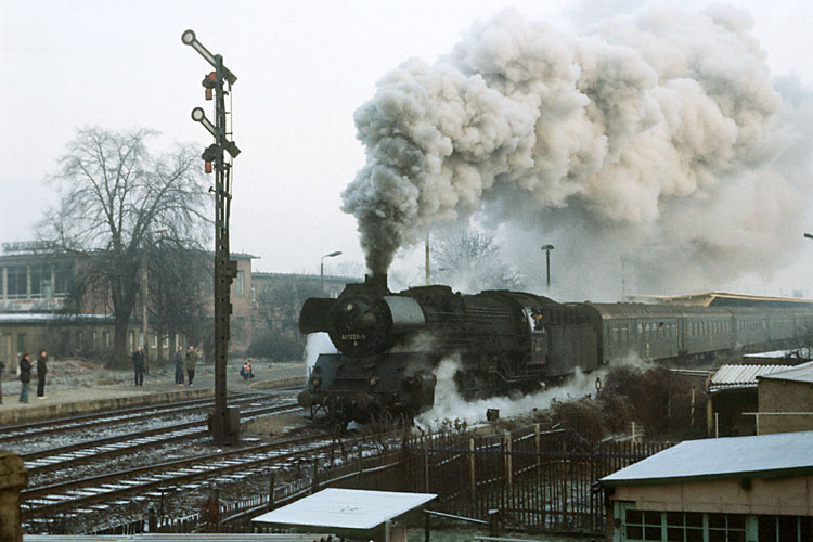 Im Herbst 1986 neigten sich die Einsätze der Saalfelder 41 und damit der letzten Dampflokomotiven Thüringens dem Ende zu. Am 29.11.1986 gab es eine würdige Dampfabschied - Veranstaltung vor Planzügen. So bespannte 41 1225 den P 3003, hier bei der Ausfahrt Jena Saalbahnhof. |