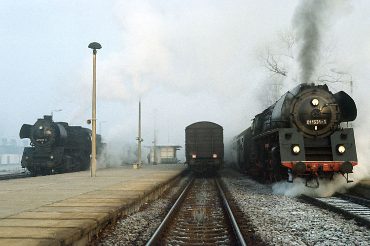 Auch 01 1531 war natürlich im Einsatz und bespannte unter anderem den D 501 Berlin - Saalfeld. Im Bahnhof Göschwitz überholte sie mit diesem Zug den P 3003 mit 41 1225, 29.11.1986. |
