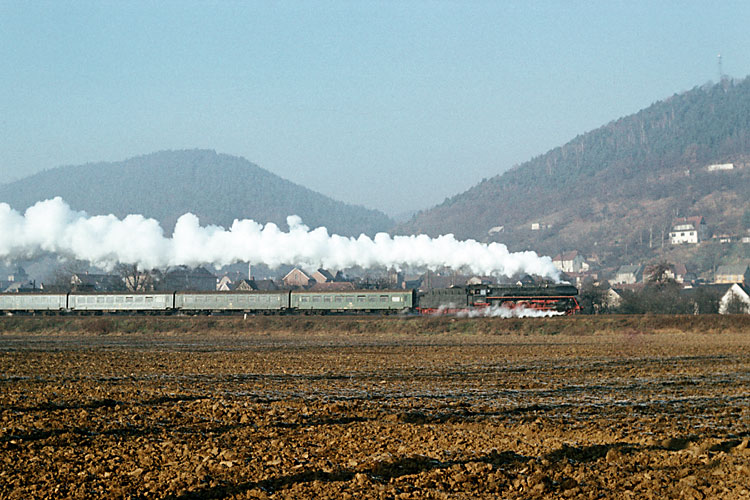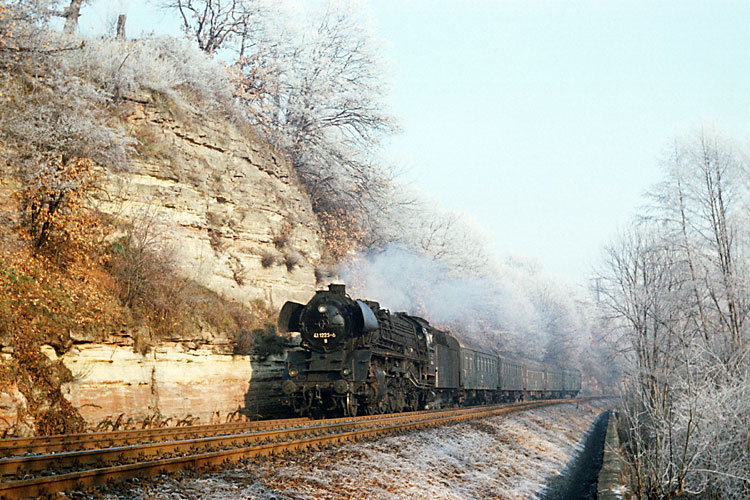 Danach ging es auch für den P 3003 weiter nach Saalfeld, hier rollt 41 1225 bei Großpürschütz Kahla entgegen, 29.11.1986. |