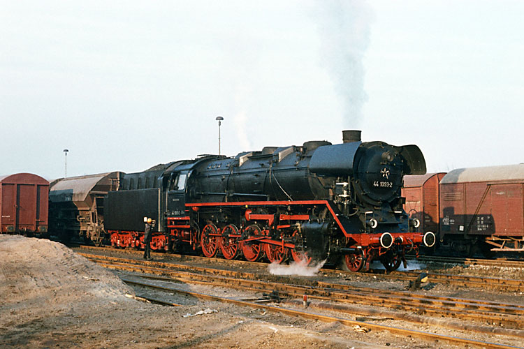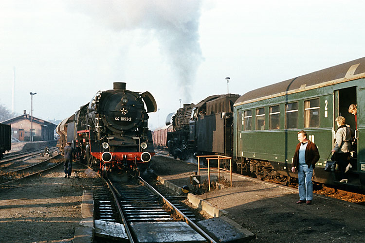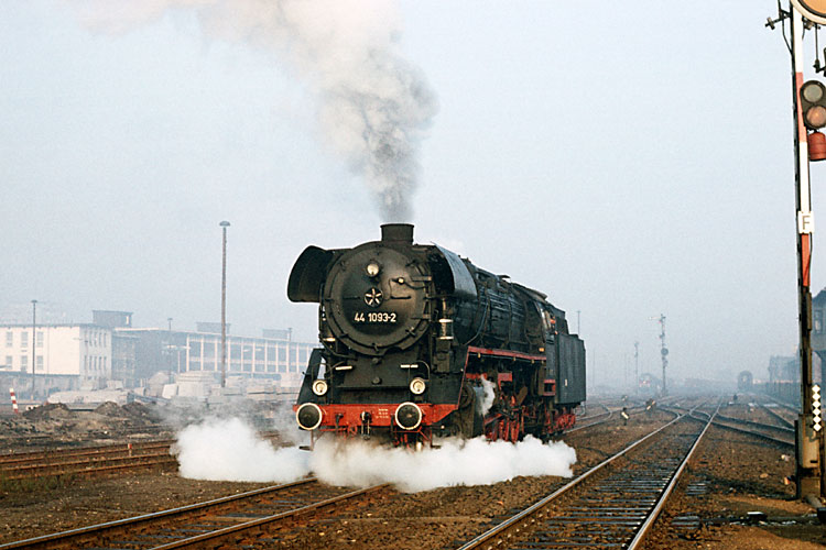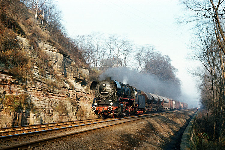 Auch an die Einsätze der Baureihe 44 sollte bei dieser Veranstaltung erinnert werden. Da es zu diesem Zeitpunkt keine streckendiensttaugliche 44 beim Bw Saalfeld mehr gab, wurde extra die Sangerhausener Traditionslok 44 1093 zugeführt. Hier fährt sie in Jena Saalbahnhof gerade zu ihrem Nahgüter nach Saalfeld, 29.11.1986. |