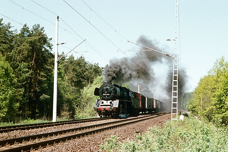 50 3545 ist hingegen mit dem N 61851 auf der nun schon elektrifizierten Strecke auf dem richtigen Gleis unterwegs und fährt an der Abzweigstelle Streesow vorbei, 26.05.1987. Nur noch vier Tage bis zum "Aus" für die Dampftraktion hier... |