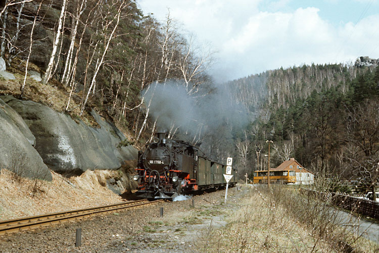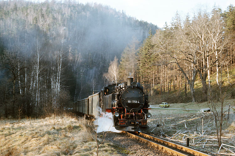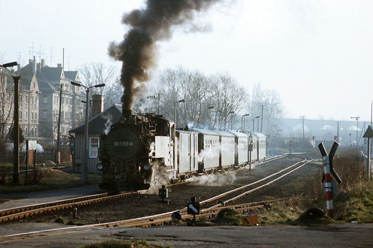 Nach Zittau angereist war ich bereits am Vorabend, so konnte ich am Morgen des 25.03.1989 gleich richtig loslegen. Da mir die Strecke noch völlig unbekannt war, arbeitete ich mich zunächst langsam von Zittau aus bergwärts vor. So nahm ich unter anderem 99 1757 mit dem P 14072 nach Oybin bei der Ausfahrt aus dem Bahnhof Zittau-Vorstadt auf. |