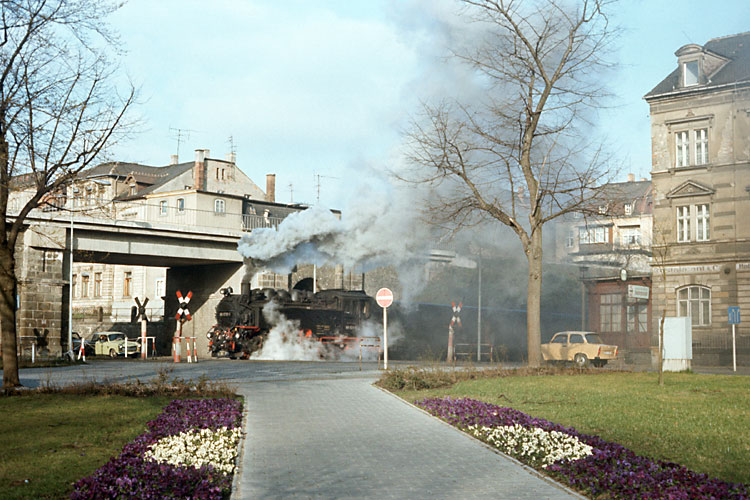Gleichzeitig war noch eine zweite Lok im Bahnhof Zittau-Vorstadt zu sehen, 99 1735 rangierte sich ihren Nahgüterzug 67282 nach Olbersdorf-Oberdorf zurecht. Sie hat dem "VEB Stahlwerk Georg Schwarz" soeben einen Wagen zugestellt und rollt nun wieder an ihren Zug. Noch hingen am Gebäude des Stahlwerkes die einst allgegenwärtigen politischen Parolen, die zu jener Zeit in der DDR schon spürbar weniger geworden waren. |
