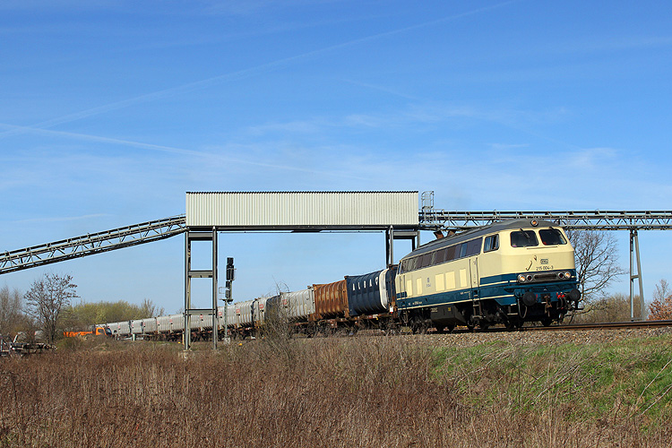 Der Kiesabbau prägt die Landschaft am Abzweig Glindenberg. 215 004 der AVG mußte mit dem umgeleiteten Müllzug von Braunschweig nach Staßfurt vor dem Abzweig warten und unterquert nun eine Förderbandbrücke des Kieswerkes, 24.03.2017. |