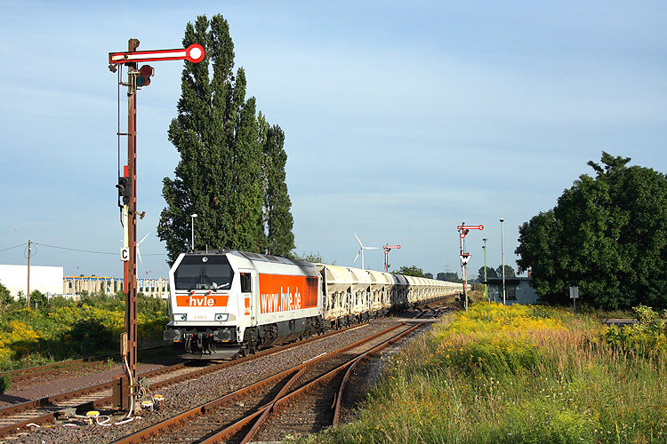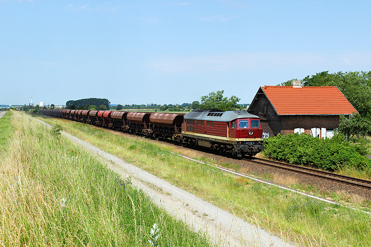 Der längste Zug, der planmäßig diese Strecke passiert, ist der zumeist am Samstag verkehrende Kieszug der HVLE nach Hamburg. V 490.3 durchfährt mit diesem hier Groß Ammensleben, 18.08.2012. |