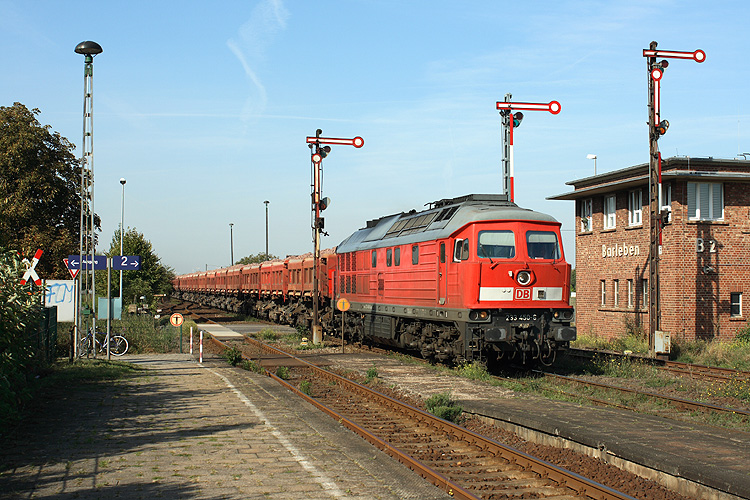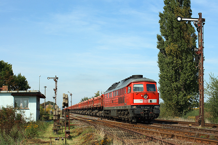 Mit einem Schotterzug von Forsthaus Eiche nach Berlin Schönefeld rollt 233 450 vorbei am Befehlsstellwerk B2 in Barleben ein, 18.09.2009. Der Bau des neuen Großflughafens Berlin - Brandenburg brachte der Strecke für einige Jahre sehr viel Schotterverkehr, heute ist dieser wieder rückläufig. |