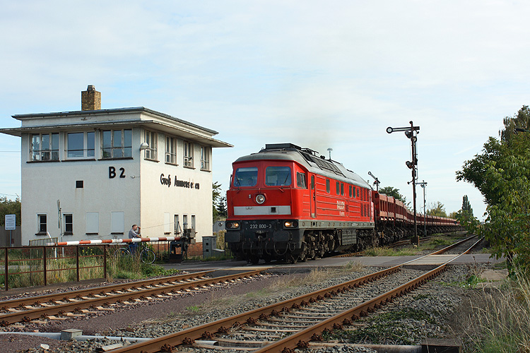 Der leere Schotterpendel aus Berlin Schönefeld verläßt gezogen von 232 800 nach der Kreuzung mit einer Regionalbahn Groß Ammensleben, 30.09.2009. |