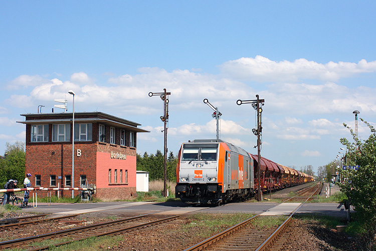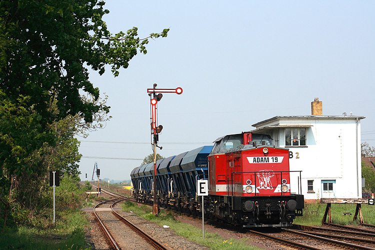 Durchfahrt durch Groß Ammensleben hat am Befehlsstellwerk B2 hingegen Adam 19 mit einem kurzen Schotterzug aus Forsthaus Eiche kommend, 29.04.2011. |