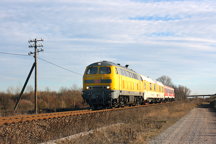 Mit einem Meßzug rollt an gleicher Stelle in Gegenrichtung 218 392 von DB-Netz auf Haldensleben zu, 25.11.2011. |