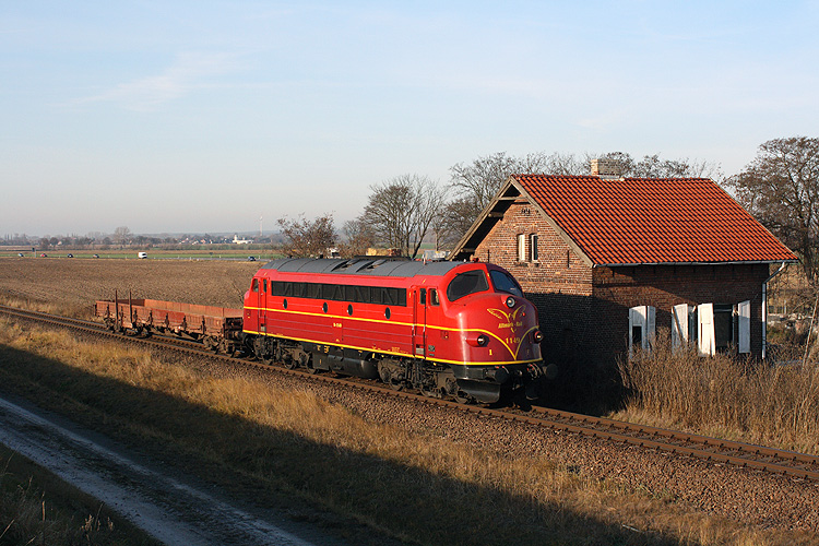 Auch MY 1149 von Altmark-Rail fährt hier ostwärts mit einem Flachwagen am Haken am alten Wärterhaus Vahldorf vorbei, 29.11.2011. |