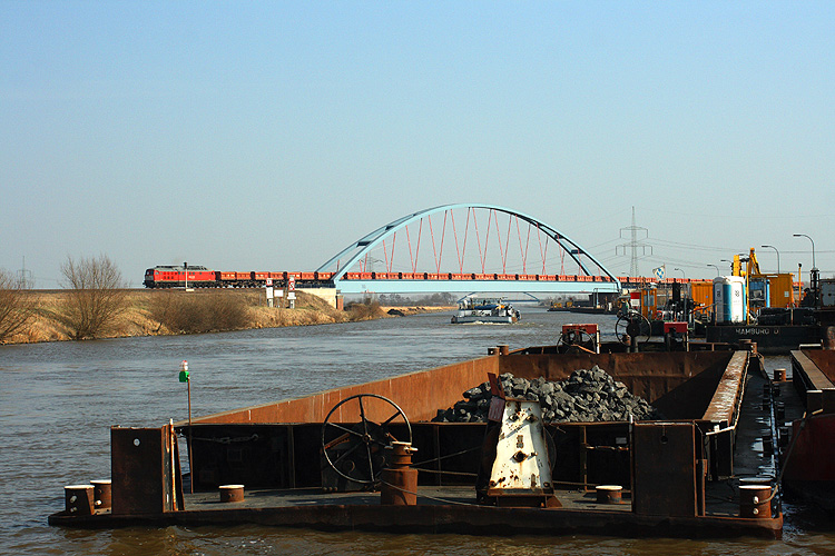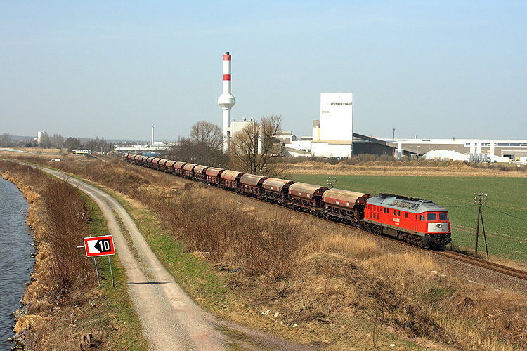 Mit einem leeren Schotterzug nach Forsthaus Eiche war 232 908 am 16.03.2012 auf der Kanalbrücke bei Groß Ammensleben zu sehen. |