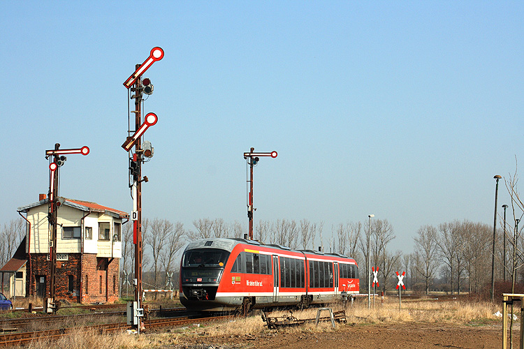 642 167 fährt als RB 27753 Haldensleben - Magdeburg aus Barleben in Richtung Abzweig Glindenberg aus, 16.03.2012. Das Ausfahrsignal D für Gleis 1 erhielt verkürzte Flügel, weil dieses Gleis und der Streckenabschnitt bis zum Abzweig Glindenberg einst mit Fahrleitung überspannt war, um E-Lok-bespannten S-Bahnzügen das Wenden in Barleben zu ermöglichen. In den achtziger Jahren kam jedoch nur einmal am Tag eine Ellok bis Barleben, so das sich diese Investition wohl kaum gerechnet hat. Nach der Wende wurde dieser Abschnitt dann wieder entelektrifiziert, die verkürzten Signalflügel aber blieben. |