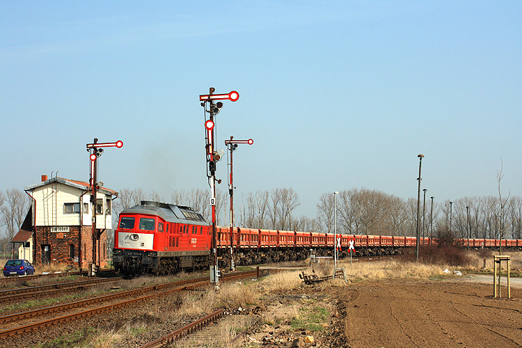 An gleicher Stelle in Gegenrichtung passiert 232 908 mit einem leeren Schotterzug nach Forsthaus Eiche das Wärterstellwerk W1, 16.03.2012. |