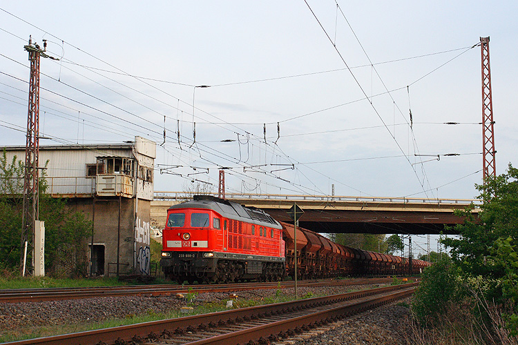 233 698 hat mit einem Düngerzug nach Baro Bülstringen den Rangierbahnhof Rothensee verlassen und passiert das ehemalige Stellwerk des Abzweig Glindenberg, 30.04.2012. Über die Brücke führt die Ost-West-Autobahn A2. |