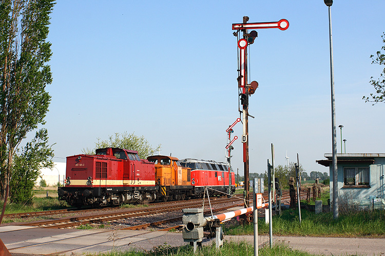 Dieser Lokzug der WFL von Lüneburg nach Nossen legte in Groß Ammensleben eine längere Pause ein, damit der Lokführer die Stangenlager der mitgeführten V 60 abschmieren konnte. Danach konnte 228 501 und die geschleppten 345 260 und 201 101 ihre Fahrt fortsetzen, 02.05.2012. |