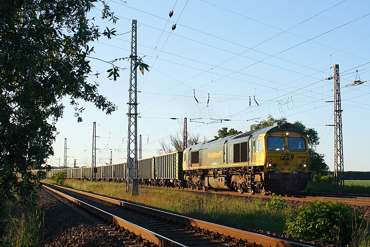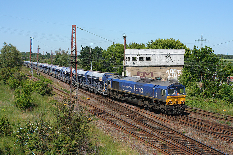 FPL 66005 war am 25.05.2012 auf der Durchreise zu einem sächsischen Steinbruch, dieses EVU fährt aber auch den Flechtinger Steinbruch an. Aus Richtung Barleben kommend kreuzt der Zug hier am Abzweig Glindenberg die Stendaler Schiene und fährt dann über das Güterzuggleis in Richtung Rangierbahnhof Rothensee weiter. |