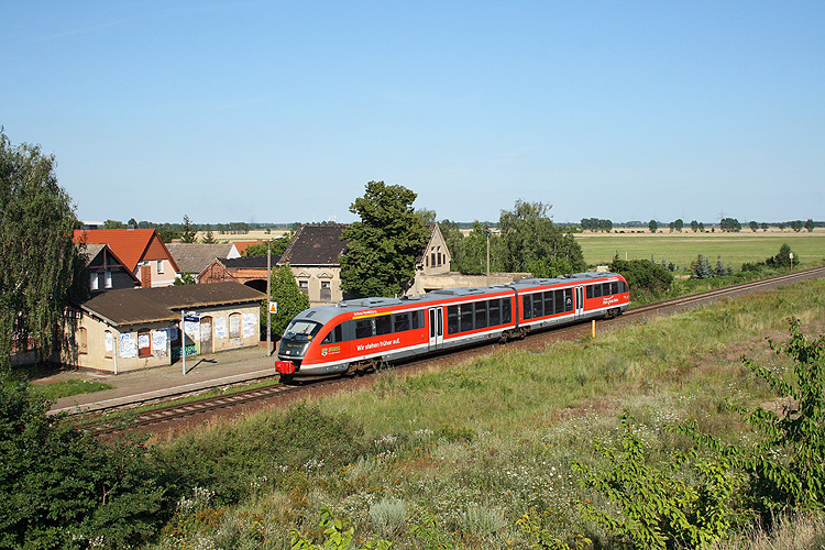 Der Haltepunkt Vahldorf wird auch heute noch im Regionalverkehr bedient, die Blockstelle gibt es aber nicht mehr. 642 225 fährt nach dem Halt als RB 27761 Haldensleben - Magdeburg wieder an, 01.08.2012. |