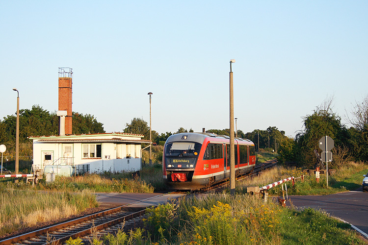Wegen des Bahnüberganges ist das Stellwerk W2 von Meitzendorf noch unentbehrlich. 642 203 fährt als RB 27726 Magdeburg - Wolfsburg aus, 13.08.2012. |