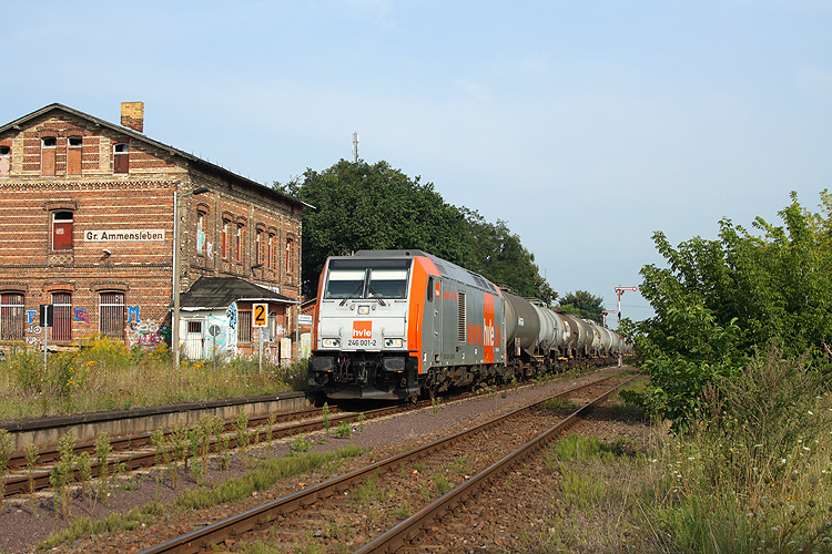 Mit einem leeren Flüssigdüngerzug von Baro Bülstringen nach Wittenberg Piesteritz fährt 246 001 der HVLE an der Ruine des Empfangsgebäudes von Groß Ammensleben vorbei, 17.08.2012. |