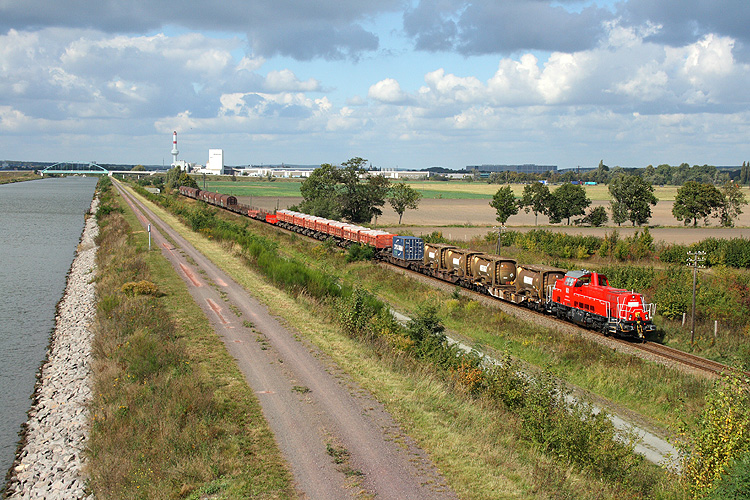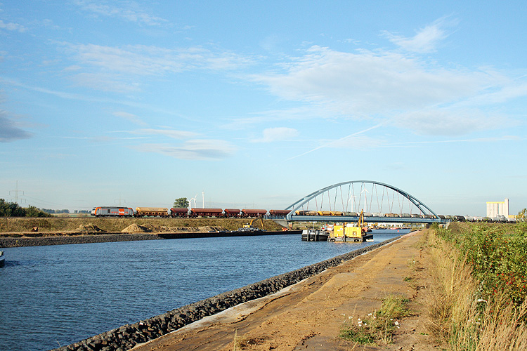 Zwischen Haldensleben und Vahldorf verläuft die Strecke parallel zum Mittellandkanal. In Höhe der Ortschaft Wedringen bringt 261 048 ihren an jenem Tag sehr langen Nahgüter nach Magdeburg Rothensee, 28.09.2012. |