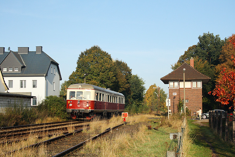Der Bahnhof Meitzendorf wird heute nur noch als Haltepunkt genutzt, das hübsche Empfangsgebäude mußte einem Parkplatz für Pendler weichen. Der Eßlinger Triebwagen DTW 01 der Dampflok-Gemeinschaft Braunschweig - Weferlingen war am 20.10.2012 im Rahmen einer Sonderfahrt durch die Börde hier zu sehen und fährt am immer noch imposanten Stellwerk B1 vorbei. |
