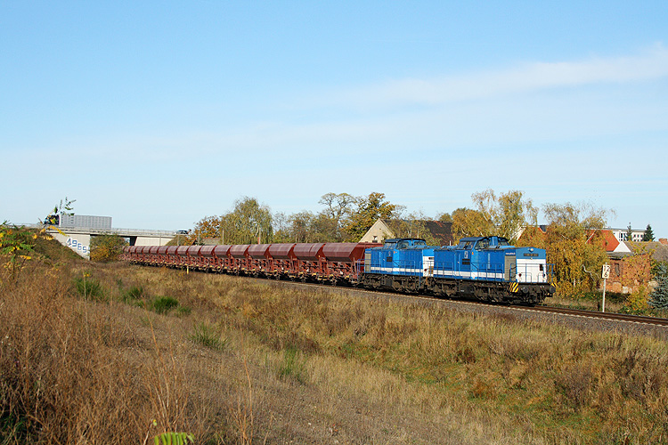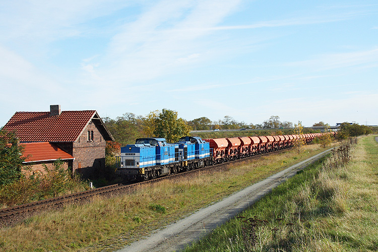 Unter der B 71 hindurch fahren am Haltepunkt Vahldorf V 100-SP-007 + 010 von Spitzke mit einem Schotterzug vom Steinbruch Dönstedt in Richtung Magdeburg, 26.10.2012. |