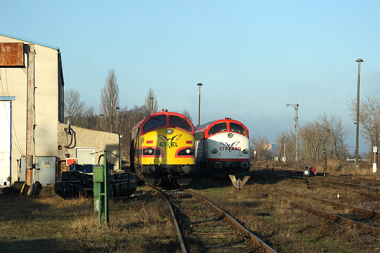 Für die aus Dänemark importierten Nohab-Dieselloks ist die Werkstatt Haldensleben die erste Adresse. Bis 2010 wurden die Loks von Eicholz-Eivel / Strabag Rail auch von hier aus im Zugdienst eingesetzt. So verbrachten am 25.12.2008 MY 1151 und 1142 hier ihre Feiertagsruhe. |