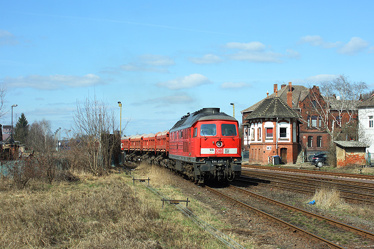 232 258 kommt mit einem Schotterzug aus Forsthaus Eiche in den Bahnhof Haldensleben hineingerollt, 20.03.2009. |