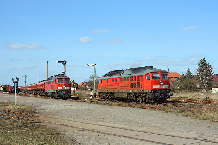 2009 herrschte im Bahnhof Haldensleben oft Hochbetrieb. Links steht 232 258 mit dem Schotterpendel nach Berlin-Schönefeld abfahrbereit, während rechts 233 709 aus Magdeburg-Rothensee zurückkehrt. Sie hatte zuvor bereits einen von der Lappwaldbahn aus Grasleben kommenden Salzzug nach Rothensee gebracht, die vor der Sanierung der Strecke Grasleben - Helmstedt über Haldensleben abgefahren wurden. Nun muß sie noch einen weiteren Schotterzug nach Rothensee übernehmen, 20.03.2009. |