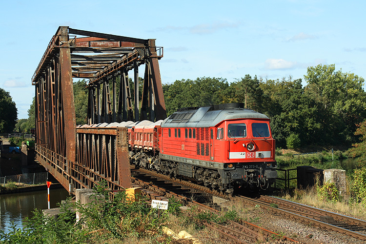 Mit einem Schotterzug aus Forsthaus Eiche kommend überquert 233 373 die alte Brücke über den Mittellandkanal bei Haldensleben, 30.09.2009. Die Brücke war mittlerweile baufällig und der gesamte Verkehr wurde über das ehemalige Oebisfelder Gleis abgewickelt, während das ehemalige Weferlinger Gleis im Vordergrund bereits stillgelegt war. Hinter der Brücke war deshalb der neue Abzweig Florastraße gebaut worden, an dem nun sowohl die Strecke nach Forsthaus Eiche / Weferlingen als auch die neue Anschlußbahn zum Barowerk Bülstringen abzweigt. |