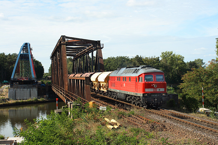 232 665 hat am Abzweig Florastraße mit einem leeren Düngerzug aus dem Barowerk auf das Streckengleis Oebisfelde - Haldensleben eingefädelt und überquert nun ebenfalls den Mittellandkanal, 30.09.2009. Links ist bereits die neue Brücke in der Montage. |