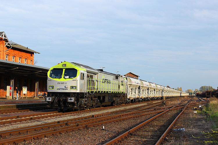 Mit den nachts verkehrenden Kiespendel Mühlberg - Ibbenbüren legte Captrain 250 007 in Haldensleben ausnahmsweise eine 24 Stunden Pause ein, 19.09.2017. |