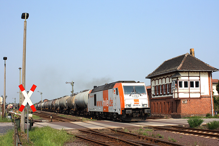 Den östlichen Bahnhofsteil steuert das Stellwerk W1, 285 001 der HVLE verläßt mit einem leeren Flüssigdüngerzug von Baro Bülstringen nach Wittenberg Piesteritz Haldensleben, 29.04.2011. |