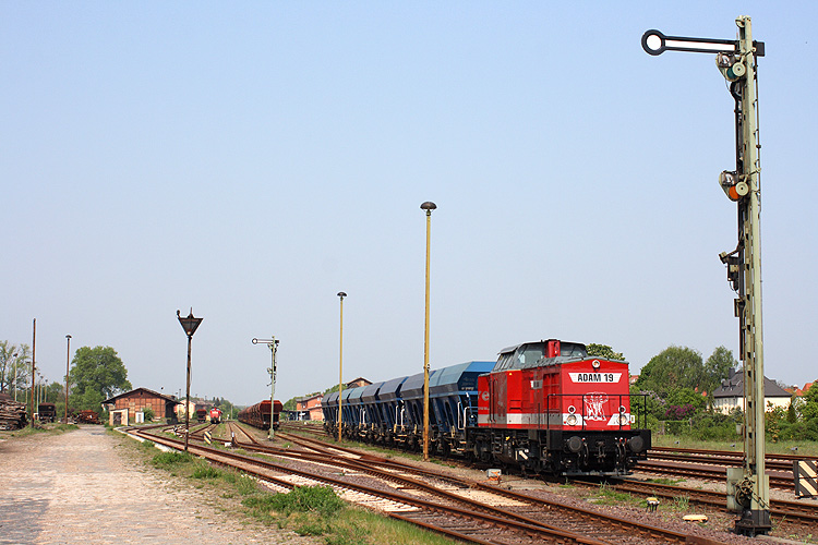 Adam 19 ist mit einem kurzem Schotterzug aus Forsthaus Eiche gekommen und wartet nun auf Ausfahrt in Richtung Magdeburg, 29.04.2011. |